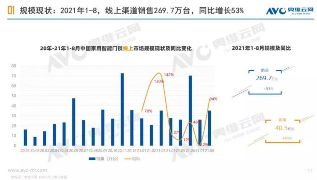 据奥维云网《2021年1-8月中国智能门锁线上市场总结报告》显示,2021年1-8月,中国智能门锁线上市场全渠道推总销量为269.7万台,同比增长53%,销售为40.5亿元,同比增长65%。这一速度让人觉得,智能门锁正在进入快车道。