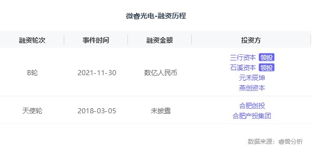 创业邦获悉,近日,合肥微睿光电科技有限公司完成数亿元B轮融资,由三行资本与石溪资本联合领投,元禾辰坤、燕创资本等多家机构参与。