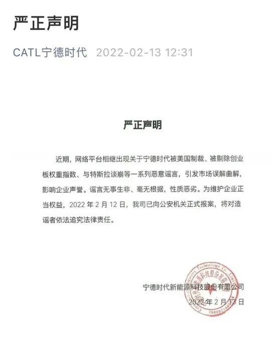【宁德时代辟谣与特斯拉谈崩等传闻】宁德时代发布声明:近期,网络平台相继出现关于宁德时代被美国制裁、被剔除创业板权重指数、与特斯拉谈崩等一系列恶意谣言,我司已向公安机关正式报案。特斯拉有关负责人13日回应称,“和特斯拉谈崩,确实不属实。”(中证报)