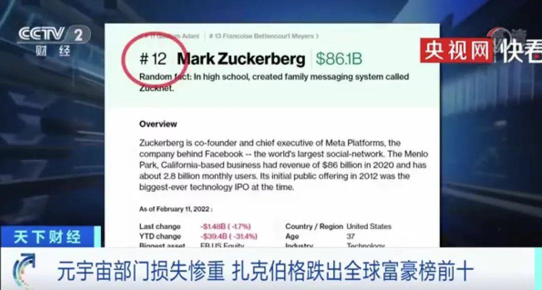 【元宇宙让扎克伯格跌出全球富豪榜前10】由于元宇宙开发部门蒙受百亿美元亏损,主营广告业务也出现增长疲态,这使得Meta公司股价重挫,扎克伯格本人也跌出了全球富豪榜前十。今年开年至今,他的财富减少了近400亿美元,缩水幅度超过30%。(央视财经)