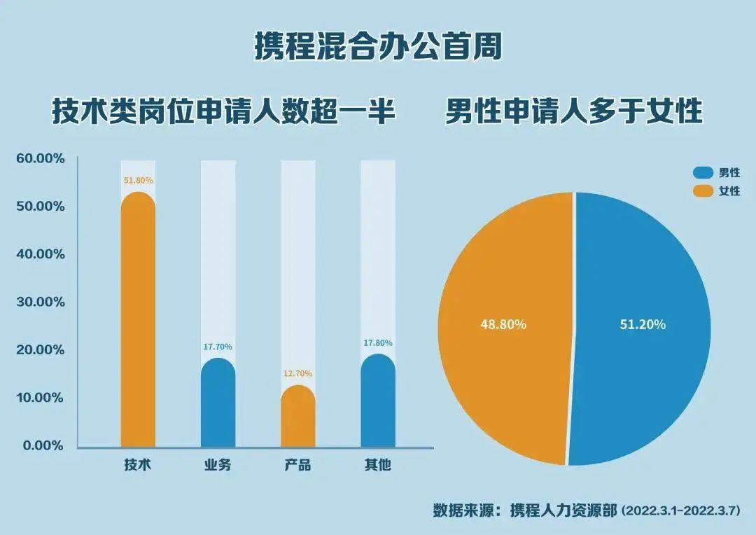 【携程“混合办公”男员工申请比例高于女员工】8日,携程公布了“混合办公”开放申请一周的数据情况:男性员工申请比例高于女员工(48.8%);90后申请占比近65%,是80后申请者的2倍;75%的申请者选择周五远程办公;近30%带娃家长在首周提交了混合办公申请。职能上看,首周申请排名前三的岗位及占比分别是技术类51.8%,业务类17.7%,产品类12.7%。