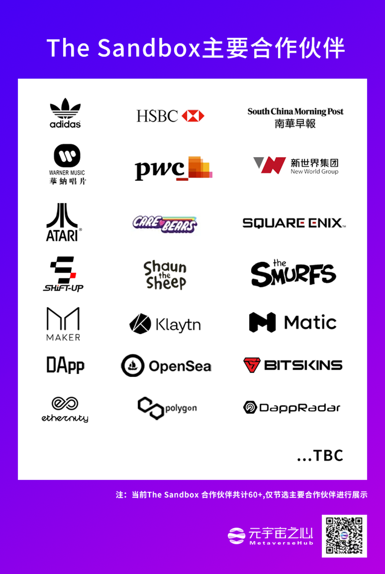 当前,The Sandbox已经与60多家公司建立了合作关系,包括汇丰银行、Adidas Originals以及Square Enix、ATARI、The Smurfs,、Care Bears等众多知名IP,一时间风头无两。