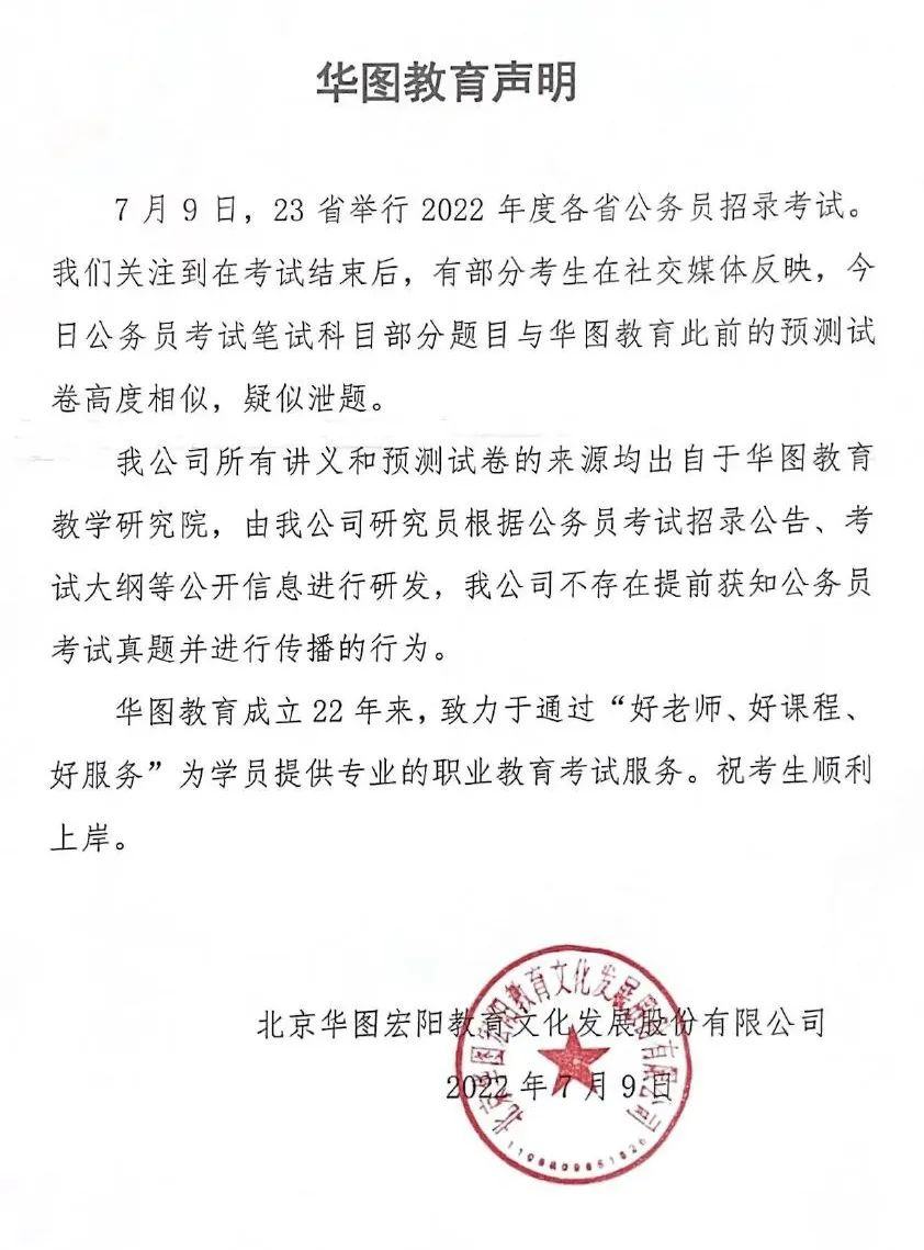 【华图教育回应公务员考试疑似泄题】公务员招录考试结束后,有部分考生反映,笔试科目部分题目与华图教育此前的预测试卷高度相似,疑似泄题。华图教育发布声明,公司所有讲义和预测试卷,均出自于华图教育教学研究院,是根据公开信息进行研发,不存在提前获知公务员考试真题并进行传播的行为。(环球网)