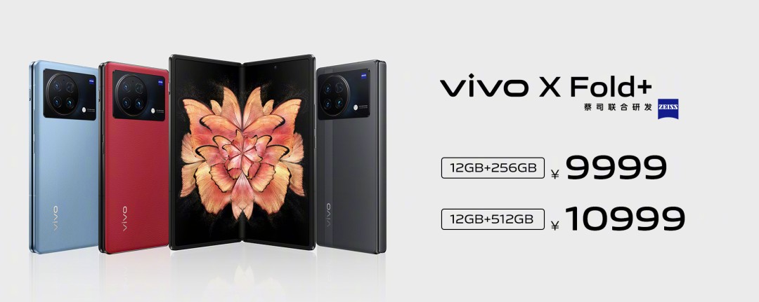 【vivo发布旗下第二款折叠屏手机X Fold+】vivo旗下第二款折叠屏手机X Fold+正式发布,提供华夏红、梧桐灰、晴山蓝三款配色,该机搭载高通骁龙8+芯片,可实现双5G双卡双通,起售价9999元。(澎湃新闻)