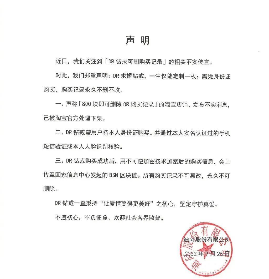 【DR钻戒:“800元可以删除购买记录”是不实传言】DR钻戒官方回应称,“DR钻戒可删购买记录”为不实传言,DR钻戒购买记录运用了不可逆技术,无法进行篡改,发布不实消息的淘宝店铺已被淘宝官方处理下架。(中证报)
