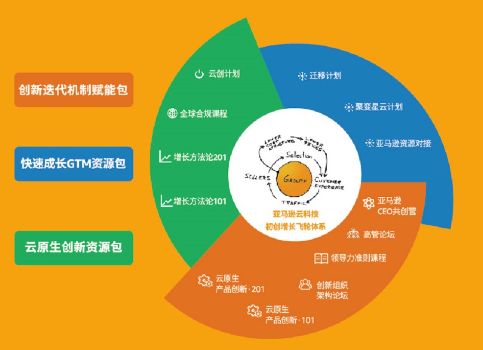 初创公司在“飞轮”的扶持资源包,GTM资源包推动下得到成长、验证市场、迭代功能,又通过“亚马逊CEO共创营”、“高管论坛”、“领导力准则课程”、“创新组织架构论坛”等推动公司进行新的一轮创新和扩张。