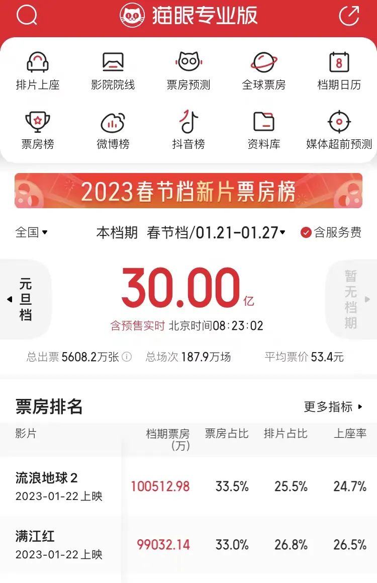 【2023年春节档总票房破30亿】猫眼专业版微博消息,2023年1月24日08时23分,2023年春节档(1月21日-1月27日)总票房(含预售)破30亿。《流浪地球2》《满江红》《熊出没·伴我“熊芯”》分列春节档票房前三位 。(光明网)