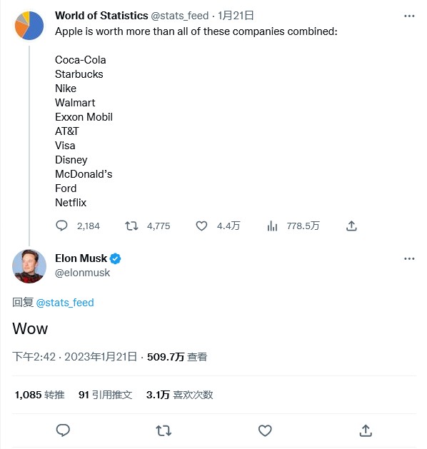 【苹果市值超过可口可乐、耐克等11家公司总和,马斯克发推“WoW”】The World Of Statistics 在最新推文中表示,苹果公司的市值已经超过了可口可乐、耐克等11家蓝筹公司的市值总和。随后马斯克转发了这条推文,并评论道:“WoW”。这些公司总市值目前为2.62万亿美元。而苹果目前市值为2.18万亿美元。目前尚不清楚The World Of Statistics是如何计算得出的。(新浪财经)