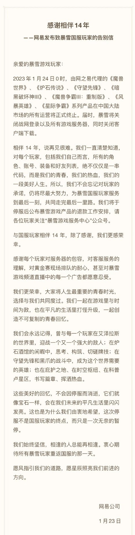 【网易发布致暴雪国服玩家的告别信:感谢相伴14年】1月23日网易发布致暴雪国服玩家的告别信,正式宣告暴雪游戏国服将于1月24日零点关闭。公司预计在停服后公布暴雪的退款工作安排。(观察者网)