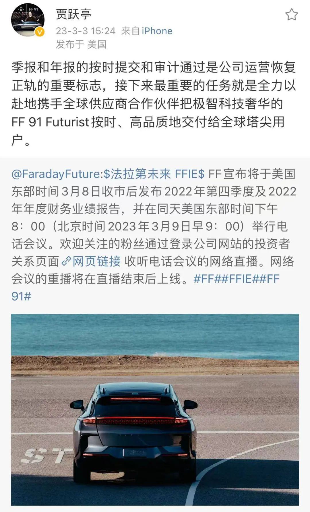 【法拉第未来宣布将发2022年财报,贾跃亭:是公司恢复正轨的重要标志】法拉第未来宣布,将于美国东部时间3月8日收市后发布2022年第四季度及2022年年度财务业绩报告。对此,法拉第未来执行官贾跃亭表示,季报和年报的按时提交和审计通过是公司运营恢复正轨的重要标志,接下来最重要的任务就是把FF 91 Futurist按时交付给用户。(界面新闻)