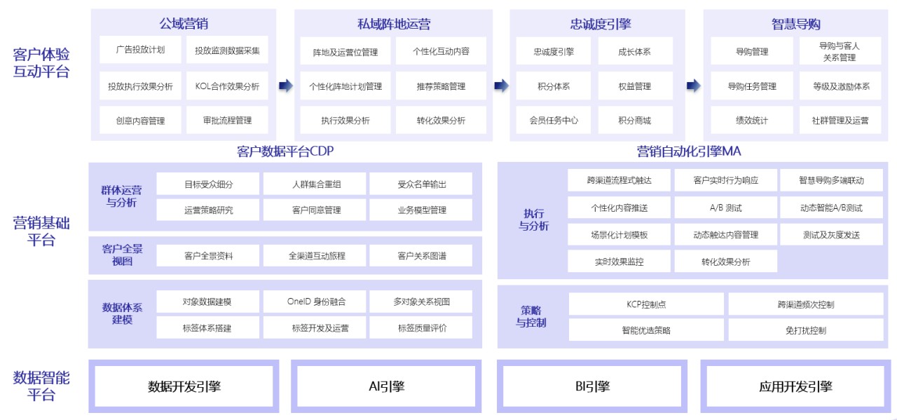 营销基础平台:CDP和MA作为用户沟通和体验的核心数据平台和决策引擎,基于用户全生命周期行为,进行全渠道、全链路的自动化、智能化和个性化沟通;