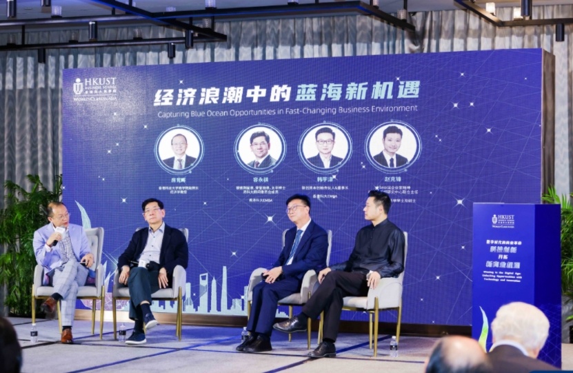 港科大商学院于上海举办主题论坛,主持人港科大商学院副院长房育辉教授,以及校友容永祺先生、韩宇泽先生及赵克锋先生,讨论在经济浪潮中捕捉蓝海新机遇。