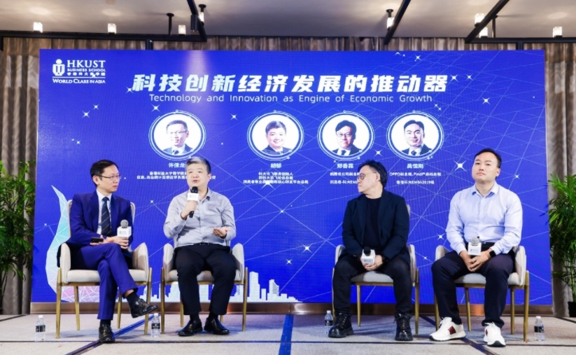港科大商学院资深副院长许佳龙教授主持论坛,联同校友胡郁先生、郑香霖先生及吴恒刚先生,探讨科技创新带来的商机。