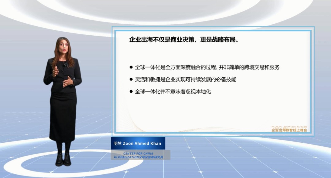 在开场致辞环节,CCG全球化智库研究员,来自巴基斯坦的明竺女士发表了演讲。她表示,近年来,我们看到了中国经济高速发展、技术创新不断进步,越来越多的中国企业开始布局海外,中国企业的身影已经遍布世界每一个角落。她认为,企业出海不仅是一个商业决策,也是一个需要深思熟虑的战略选择。企业在出海过程中,不仅要有全球视野和敏锐的市场洞察力,更要有技术创新能力。