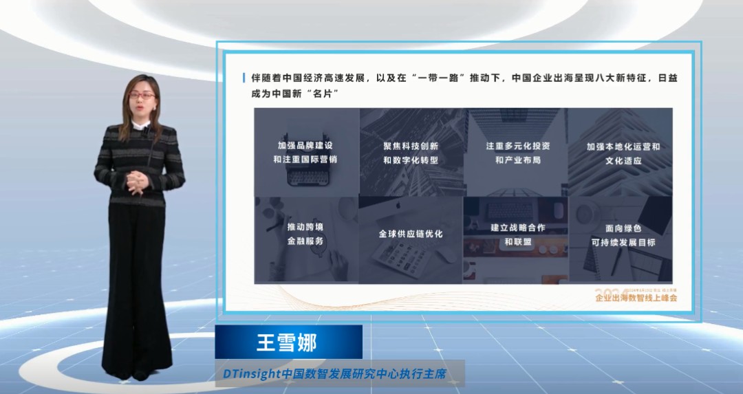 本次线上峰会上午场,DTinsight中国数智发展研究中心执行主席王雪娜发布了《中国企业出海数智发展白皮书》。她表示,DTinsight一直将深度研究和前瞻性洞察视作我们的使命,中国企业出海是我们关注并研究的关键领域。在解读中,她指出,白皮书分析了技术在中国企业出海过程中的关键作用,以及市场趋势和战略策略的重要性,这份白皮书不仅是对中国企业出海战略的剖析,更是对行业未来走势的有益启示。最后,她总结,中国企业出海道阻且艰,行则将至,行稳致远,未来可期,我们期待与您一同开启全球商业新的篇章。