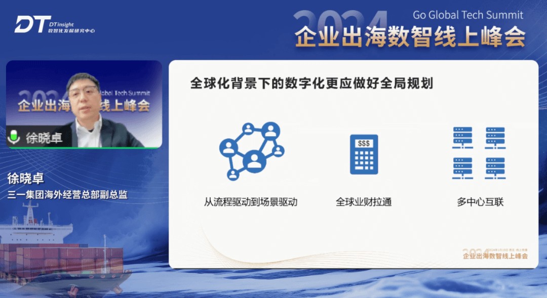三一集团海外经营总部副总监徐晓卓发表了『制造出海的数字化挑战与思考』的主题演讲。他表示,海外的数字化工作面临着多语言、多法规等方面的挑战。其中,“孤岛”系统难以支撑管理决策、“众口难调”用户满意度低是海外企业数字化面临的核心问题。对此,徐晓卓认为,全球化背景下的数字化更应做好全局规划,从实践经验上看,需要做好以下三件事:一是从流程驱动到场景驱动,海外软件开发已经从传统模式向敏捷的模式转型,面向业务场景解决问题;二是全球业财拉通,这是全球数字化做好的根本;三是实现多中心互联,以便更好做到合法合规要求。