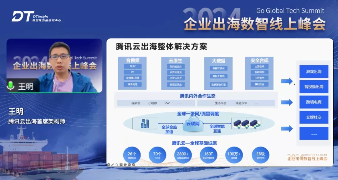 腾讯云出海首席架构师王明发表了『腾讯云全球服务助力企业数智出海』的主题分享。他认为,出海企业面临着网络、终端、安全、文化、合规以及创新等方面的挑战。对此,他指出,腾讯云的基础设施遍布全球五大洲26个地区,运营70个可用区,为客户提供强大的技术支持。腾讯云出海整体解决方案,从全球基础设施,到内外合作生态,再到主要的明星产品以及服务,支撑着游戏出海、音视频出海、跨境电商、文娱社交等行业及不同领域的出海企业服务。