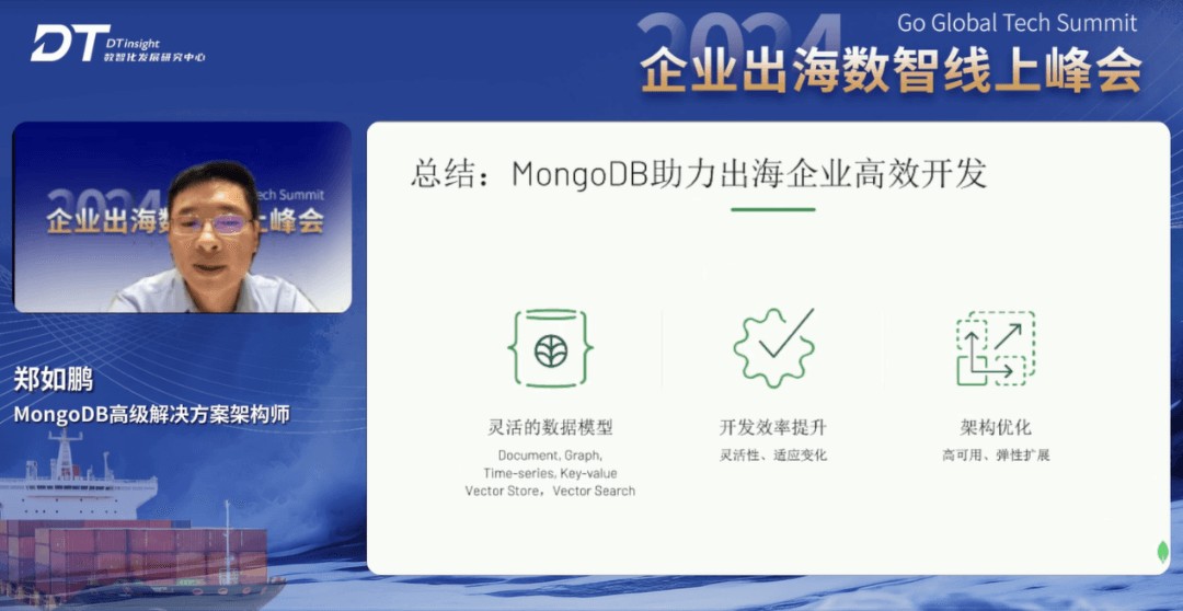 MongoDB高级解决方案架构师郑如鹏发表了『MongoDB开发者数据平台助力出海企业高效开发』的主题演讲。他指出,当前,数据问题数据在企业中是多样性的,固化复杂的关系型数据模型阻碍了应用程序的快速迭代;脆弱的单片、旧式关系系统无法提供恢复能力和扩展能力;小众 NoSQL 数据库大多功能局限,丢失了基本的开发功能等“数据问题”是开发者面临的最棘手的问题。MongoDB作为数据开发者平台,通过数据模型、开发效率提升和架构优化三个方面,保证出海企业应用高效开发,以及灵活部署形态,助力出海企业进行业务拓展。