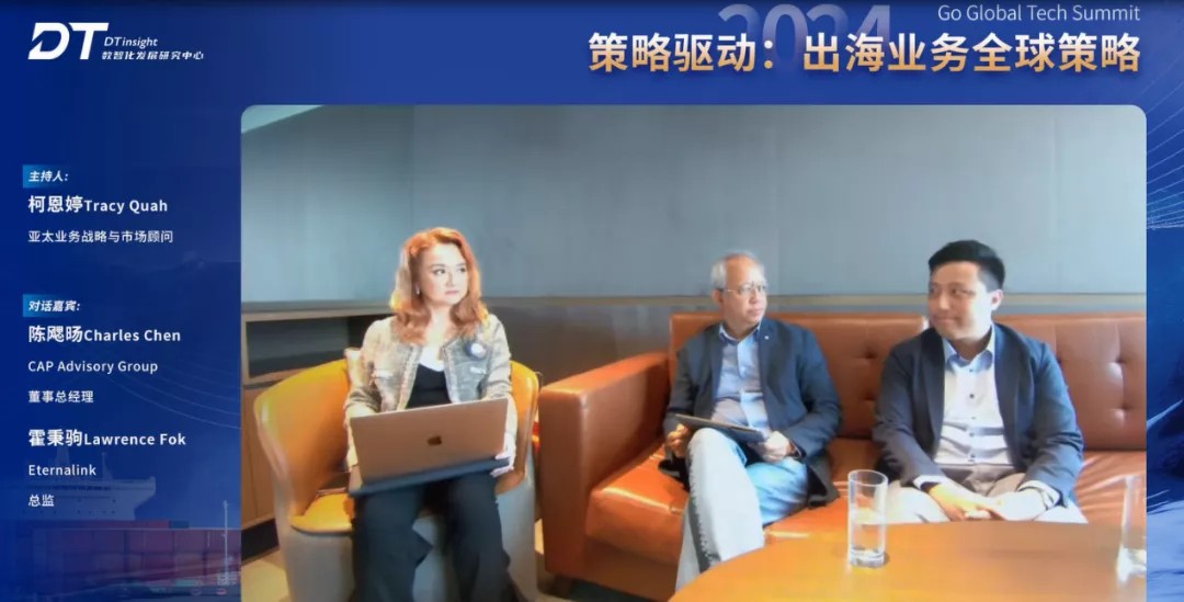 第三场圆桌对话,以“策略驱动:出海业务全球策略”为主题,邀请到Eternalink总监霍秉驹Lawrence Fok, CAP Advisory Group 董事总经理陈飔旸Charles Chen,在亚太业务战略与市场顾问柯恩婷Tracy Quah的主持下,三位嘉宾在新加坡的直播现场,共同探讨新加坡如何成为中国企业出海和设立总部的热门地区,同时就企业出海的趋势,出海的策略进行了深入的探讨。