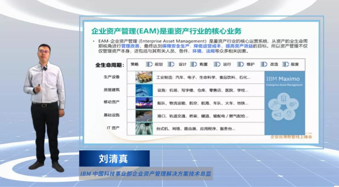 IBM 中国科技事业部企业资产管理解决方案技术总监刘清真分享了『IBM Maximo 助力出海企业全球化资产运营』主题演讲。他强调,企业资产管理(EAM)是重资产行业的核心业务,从资产的全生命周期视角进行管理改善,最终达到保障安全生产,降低运营成本,提高资产效益的目标。IBM Maximo是专业的企业资产管理(EAM)解决方案,为企业出海保驾护航。