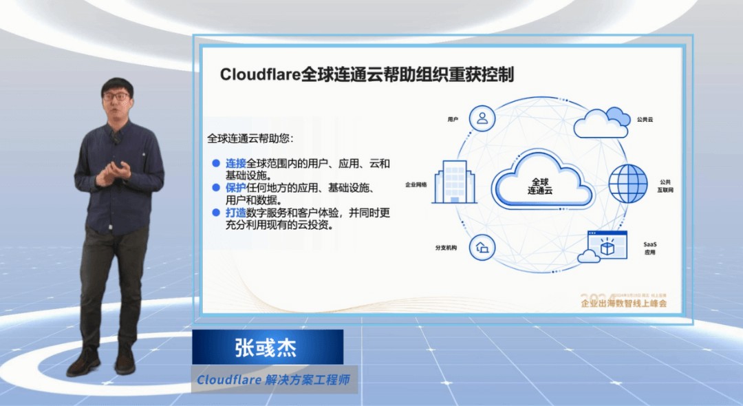 Cloudflare 解决方案工程师张彧杰发表了『Cloudflare全球连通云为企业出海保驾护航』精彩演讲。Cloudflare 作为唯一的可组合、互联网原生平台,凭借全球规模提供本地化功能。基于Cloudflare覆盖全球的基础设施,Cloudflare全球联通云从以下三个方面帮助企业出海解决面临的挑战:一是连接全球范围内的用户、应用、云和基础设施;二是保护任何地方的应用、基础设施、用户和数据;三是打造数字服务和客户体验,并同时更充分利用现有的云投资。