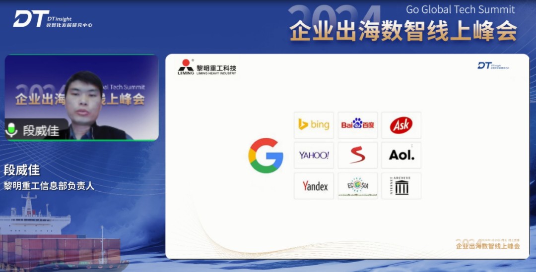 黎明重工信息部负责人段威佳发表了题为『黎明重工出海数字化之路』的实践分享。他表示,黎明重工的数字化转型之路经历了传统营销、电子商务和数字化营销三个阶段。其中数字化营销阶段,黎明重工的数字化营销由SEO技术优化、品牌营销、渠道拓展、EDM邮件营销、SNS社会化营销、PPC竞价、UED用户体验、项目研发和市场信息九个团队组成。并且通过与谷歌、必应、百度、AOL等国际知名的搜索引擎企业合作进行海外拓展。
