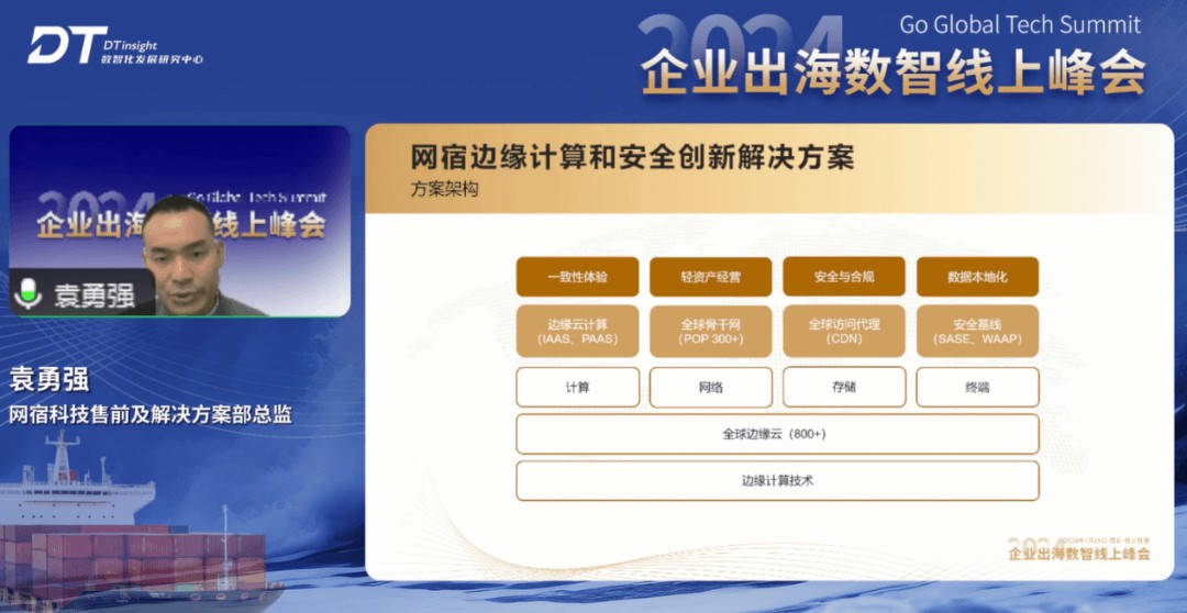 网宿科技售前及解决方案部总监袁勇强发表了『边缘创新,加速企业全球化』的主题演讲。他表示,全球化IT基础建设面临全球用户一致性体验、轻资产运营和服务化、数据安全与合规、数据本地化等挑战。基于此,网宿边缘计算和安全创新解决方案通过边缘计算技术确保客户CDN和SD-WAN网络实现业务全球覆盖,实现客户全球网络支撑全球一致性体验,提供云网边端服务化,实现轻资产经营,帮助客户构建安全基线出海防护栏,并且基于边缘计算节点分布助力客户实现数据本地化,实现业务全球化发展。
