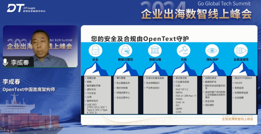 OpenText中国首席架构师李成春以『OpenText内容智能助力出海企业扬帆远航』为题作了分享。他认为,企业出海面临的挑战包括合规安全、业务敏捷性、全球协同及管控、业务流程支持和业务效率。其中,合规及安全要求日趋严格。OpenText不同的解决方案为企业提供安全合规的保障,通过管理机制、标准化最佳实践为客户提供数据完整性和数据治理服务。OpenText还基于取得认证的标准,为用户提供合规服务,并通过完善的机制和架构为客户提供隐私保护,确保业务连续性。