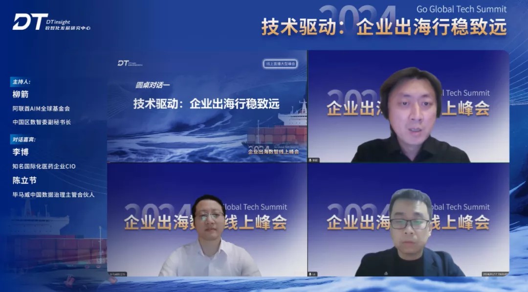 首先,第一场圆桌对话,以“技术驱动:企业出海行稳致远”为主题,邀请到毕马威中国数据治理主管合伙人陈立节,知名国际化医药企业CIO李博,在阿联酋AIM全球基金会中国区数智委副秘书长柳箭的主持下,三位嘉宾共同就出海技术中遇到的挑战与实践进行了分享。李总谈到,因为制药属于特殊行业,出海场景更加复杂,在技术如何海外落地、数据传输及海外人才储备等各个环节都应因地制宜,采取不同的应对策略。陈总也从数据治理角度谈到出海数据合规管理的一系列问题。