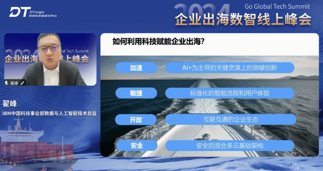 随着科技的不断进步,AI和数智技术已逐渐成为推动企业出海的关键动力。IBM中国科技事业部数据与人工智能技术总监翟峰发表了『AI+数智驱动出海企业转型升级』的主题演讲。他指出,IBM认为科技在赋能企业出海方面有四个方面共性,一是安全,企业的系统一定要构建在安全的混合多云基础架构之上,包括网络、数据等安全;二是开放,越来越多企业希望构建互联互通的企业生态,打通企业内外部以及供应链系统,实现高效;三是敏捷,在互联互通的企业生态基础之上构建敏捷的标准化智能流程,更好应用到企业流程,提升用户体验;四是加速,随着越来越多的数据产生,企业需要AI+为主导的关键资源上实现突破创新。