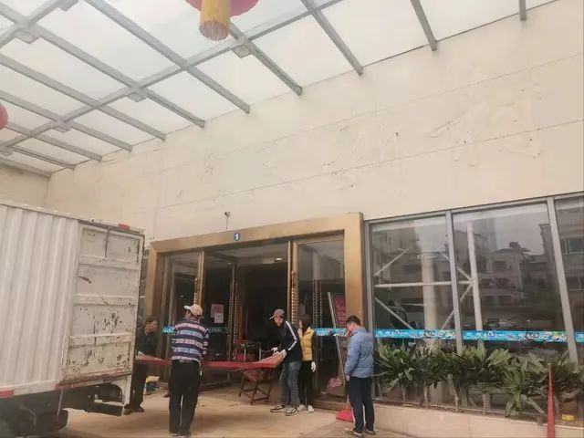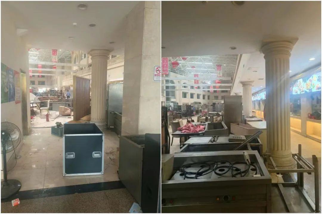 走进店内,原本宽敞气派的宴会大厅,如今只剩下四处零散在地、等待打包的各种物品。