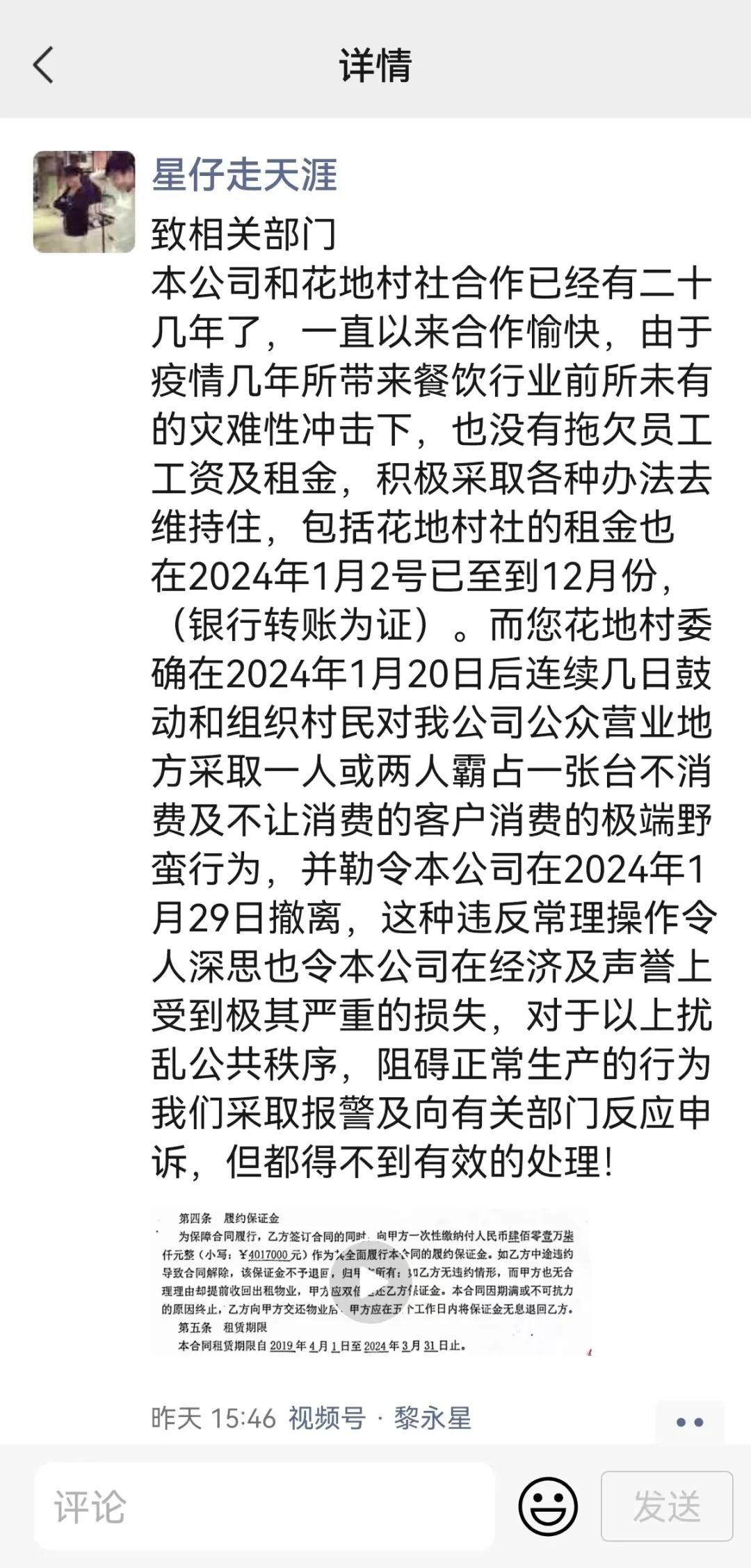 对此,黎永星则在上述微信朋友圈透露,公司和花地村社合作二十几年来没有拖欠员工工资及租金,并于今年1月2日向花地村社交了包含去年12月及之前拖欠的租金,目前已向有关部门申诉物业方阻碍芳村店正常生产的行为。据悉,渔民新村芳村店与物业方目前的租约到期时间为2024年3月31日。