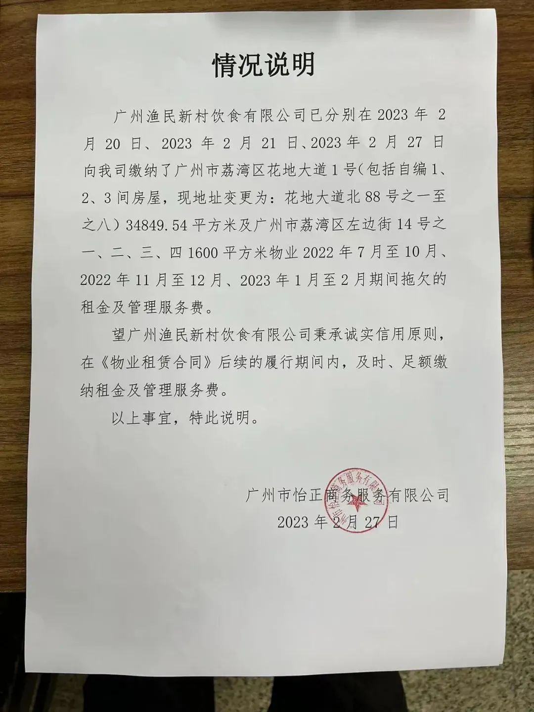 2023年2月,怡正公司曾发布通知称,渔民新村芳村店拖欠其2022年7月-2023年2月的租金和管理费,合计款项1095.52万元,如芳村店未能按期缴纳,怡正公司将收回物业。