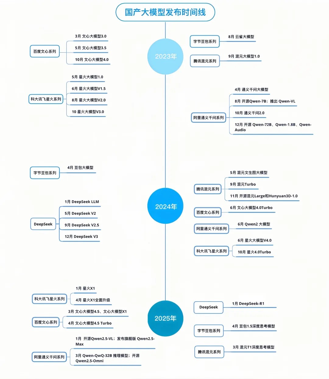 以DeepSeek-R1(2025年1月20日发布)为时间基准线,当月科大讯飞就发布了深度推理大模型——讯飞星火X1;3月,百度发布文心大模型X1,阿里发布通义千问Qwen-QwQ-32B推理模型,腾讯发布混元T1深度思考模型;4月,字节豆包1.5深度思考模型上线,同时讯飞星火X1迎来升级,发布“快思考、慢思考统一模型”。