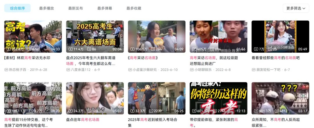 在B站,高考采访名场面成了每年固定的百万播放爆款,也是鬼畜区的最佳素材库。10年前,关晓彤因考后采访一战成名,坐稳学霸人设。6年前,化名“林欢”出场考生面对媒体已读乱回,成为年年被考古的名场面。今年,三位考生先后喊话樊振东回归赛场,直接冲上热搜高位。近几年,带立牌、出cos、举横幅等一系列“花式接考生”活动也成为了集中发力区。