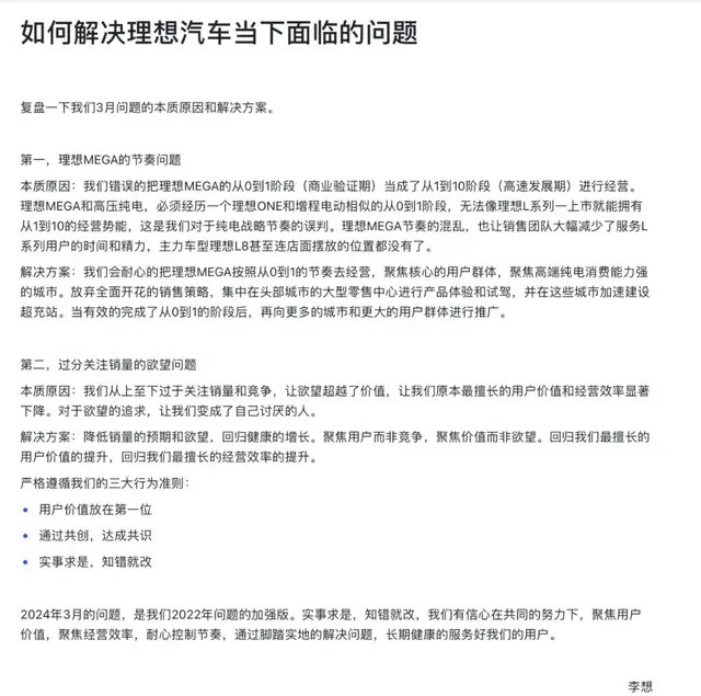 MEGA上市当月销量遭受重创,李想迅速牵头反思并做出调整。随即发布全员内部信,承认自己错判了理想MEGA的发展节奏,并指出公司上下过分关注销量和竞争而非用户价值,并在当时确立了接下来将「NPS」作为首要目标的销售导向。