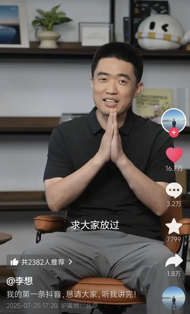 从最初的口出狂言、说教式输出,变为如今的接地气路线,李想的风评也在悄然变化。7月25日,李想的第一条抖音视频上线,是调侃自己当初出圈的发飙视频。这在过去,恐怕不可想象。