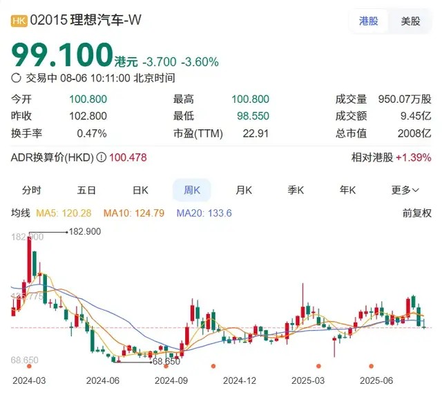 2024年2月,理想汽车股价一度涨至182港元。这得益于2023年的出色年报,年报显示,理想汽车2023年全年营收为1238.5亿元,较2022年452.9亿元增加173.5%。理想汽车成为中国第一家年营收突破千亿元的新势力车企。财报发布后,理想汽车当天股价上涨25%。