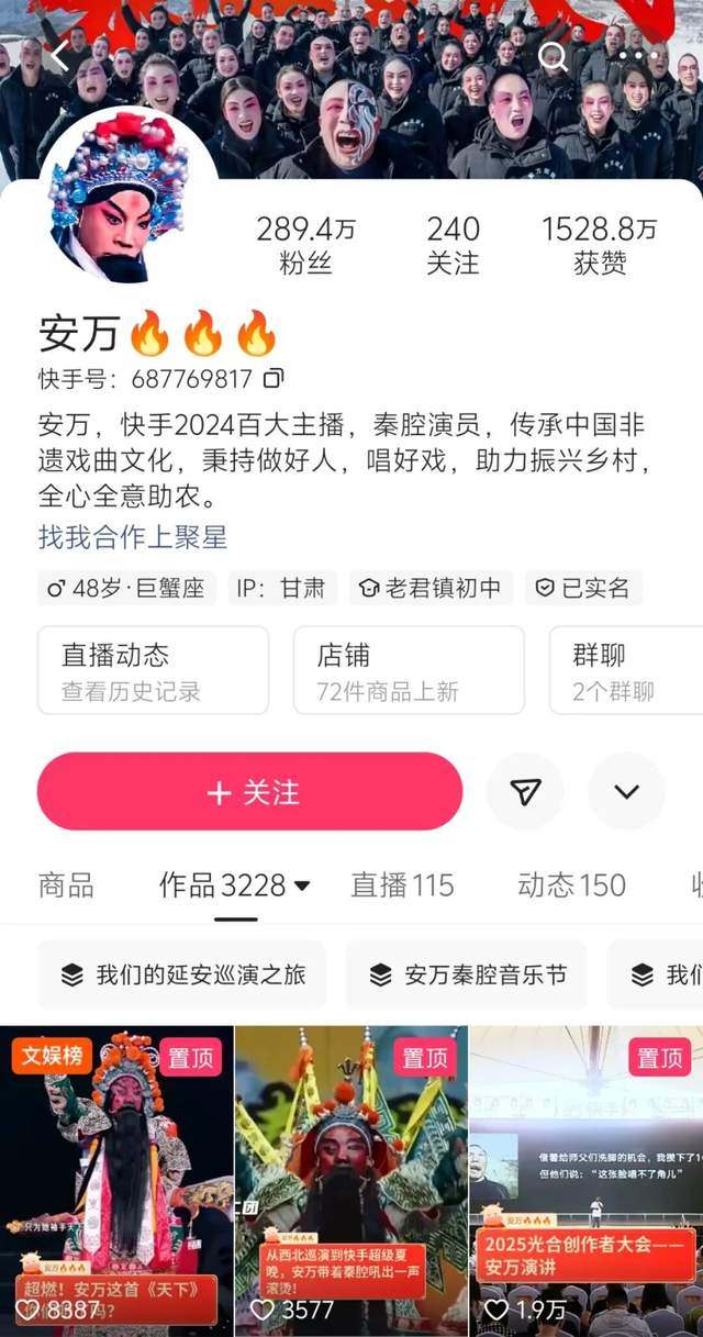 火遍快手全站的秦腔演员安万,最初只专注于直播戏台演出,粉丝量卡在 30 多万停滞不前。此后他开始拍摄短视频,内容涵盖教女儿练戏、剧团后台的鸡毛蒜皮、安万说戏等,这些充满烟火气的内容让他的人设变得立体。一年时间,安万的粉丝就从 38 万涨到了287万,月均涨粉20万。