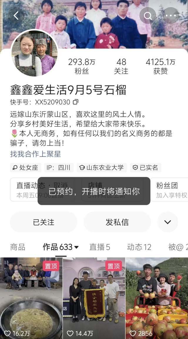 ▲@鑫鑫爱生活在快手主页开启了直播预约功能