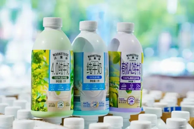 紧邻烘焙区的便是另一个生活高频品类液态奶,网红大单品沃集鲜4.0纯牛奶被摆在醒目位置,果蔬、肉禽蛋、冻品等位于门店最里侧。