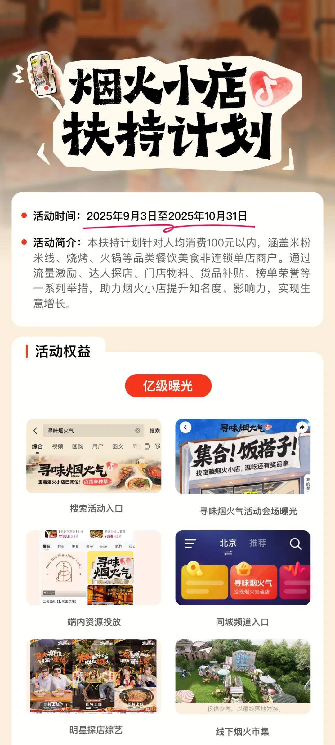 在线下,平台免费为商家提供海报、门贴等进店物料,以及价值百万元的货品补贴。获得扶持的中小商家还有望登上当地的「烟火榜」,获得更多流量,进而被更多人看见。