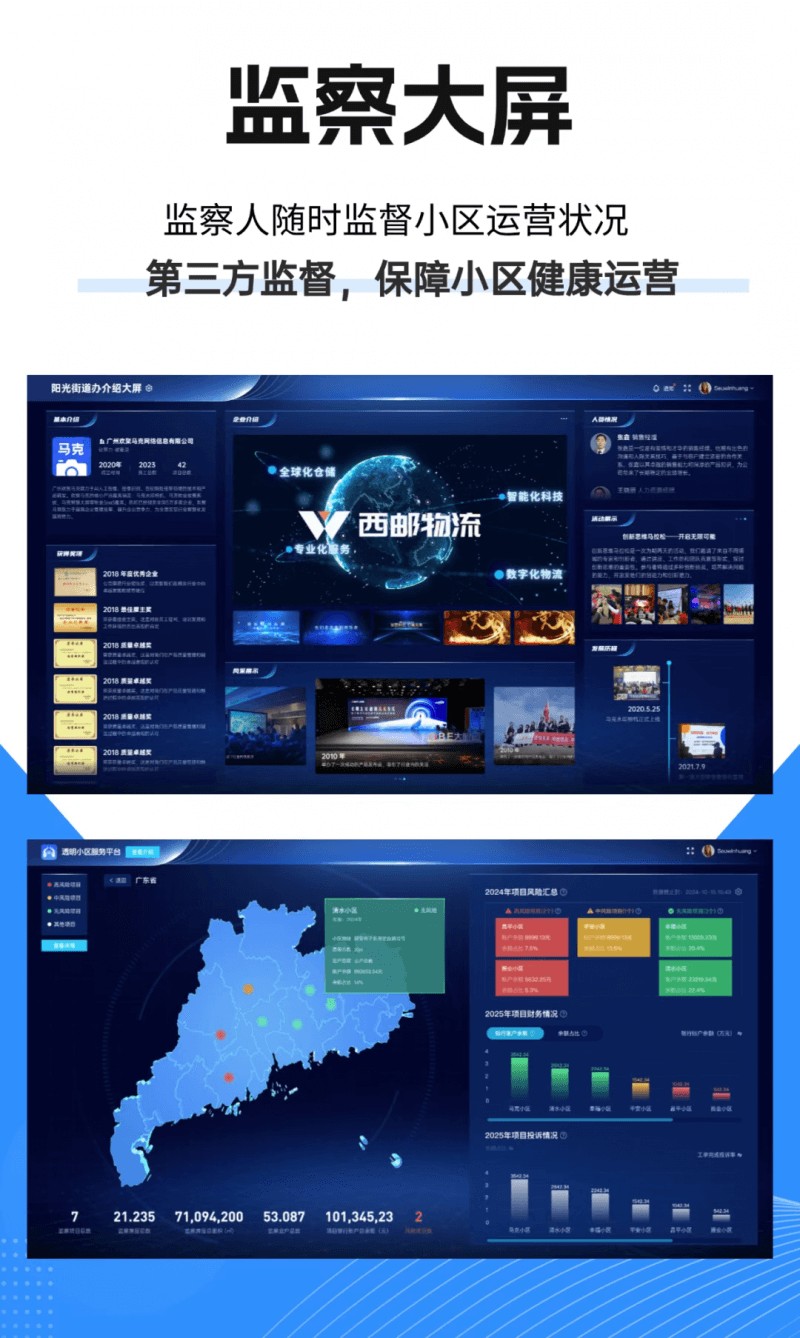 此外,马克透明小区服务平台专为第三方监察人提供智能监察大屏,集项目风险汇总、银行账户余额展示、项目投诉情况追踪等功能于一体,解决社区和监督人员的在线管理需求。一旦出现异常风险,系统将自动触发告警机制,监察人员能够即时调取异常详情,实现对辖区内所有项目的远程动态监管。