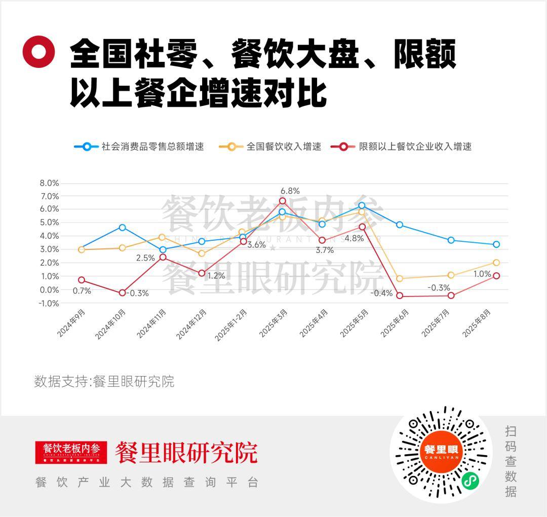 数据显示,除2024年11月、2025年1-2月、2025年4月这三个统计时间段,自2024年9月以来,全国餐饮收入增速已9个月均低于社会消费品零售总额增速;更严峻的事实是,除2025年3月外,200万元及以上限额餐饮企业收入增速已11个月低于社会消费品零售总额增速,甚至在2025年6月、7月持续出现负值,显示出大型品牌餐饮企业的持续承压。