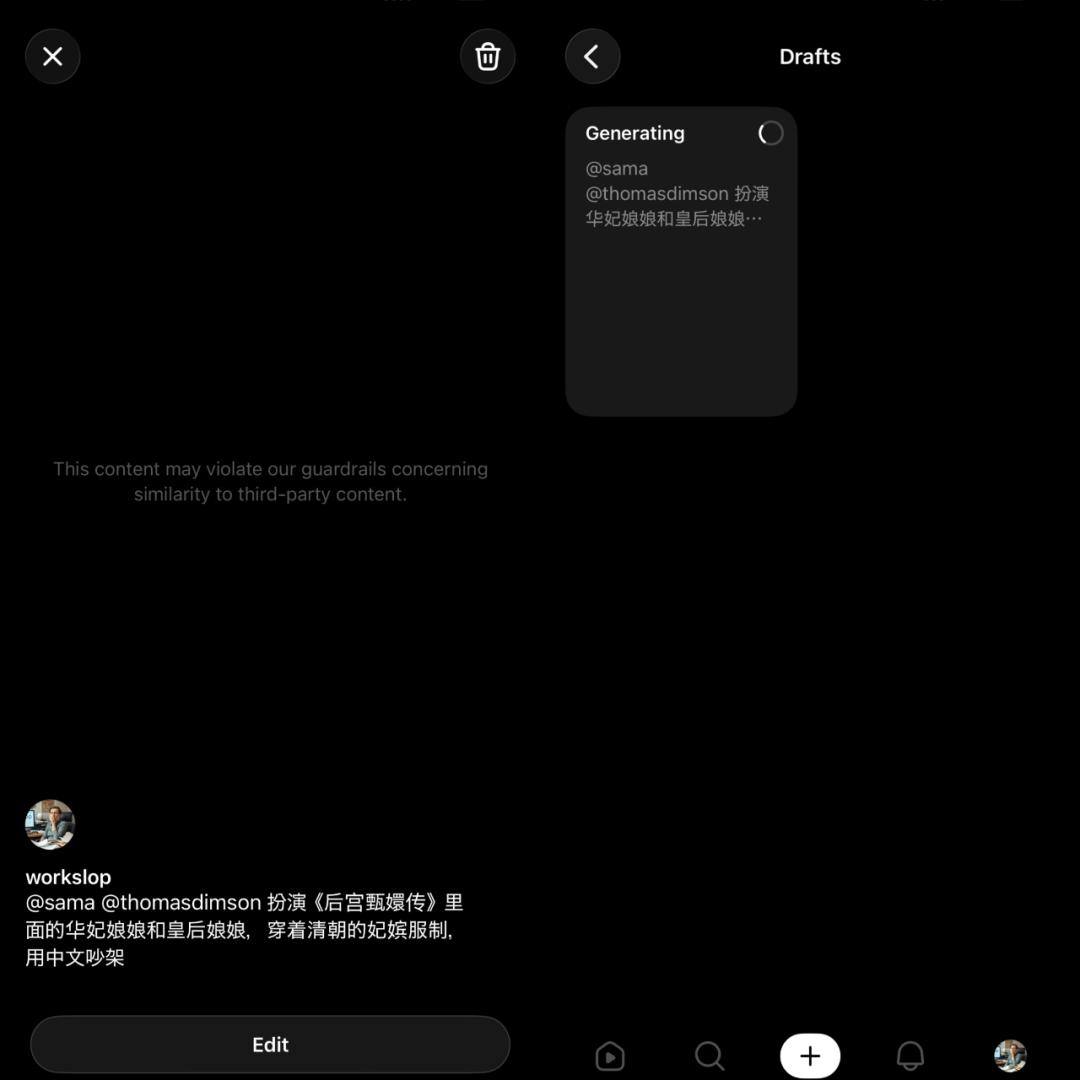 DoNews又以奥尔特曼和另一用户的数字形象创建了一段多角色视频,提示词是:“@sama@thomasdimson扮演《后宫甄嬛传》里面的华妃娘娘和皇后娘娘,穿着清朝的妃嫔服制,用中文吵架。” 系统检测到版权问题无法生成,删除提示词中的《后宫甄嬛传》后,生成就不再被拒绝。