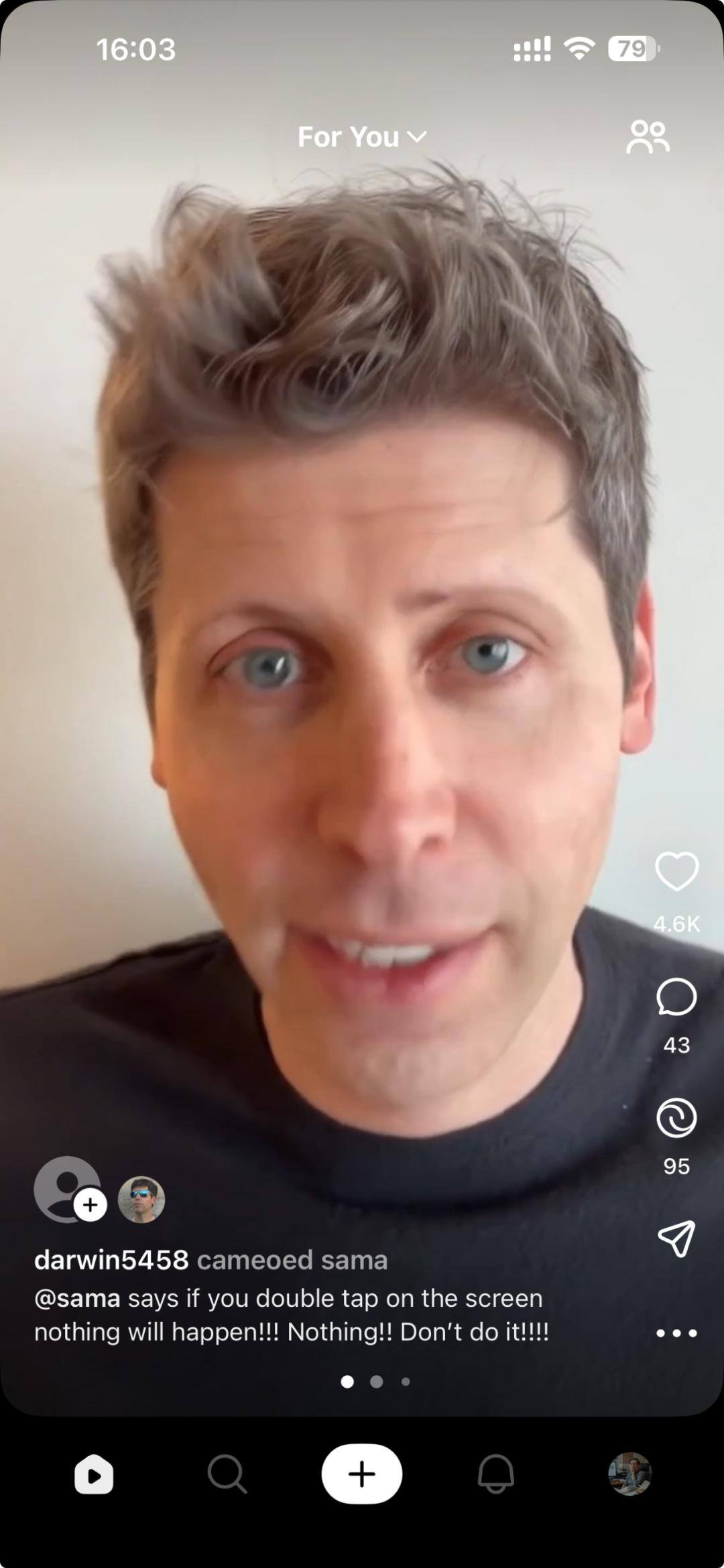 进入 Sora App 后,主页底部设有功能栏,从左到右依次为「视频推荐」「灵感广场」「生成器」「消息」「个人主页」。很多人将其称为 “AI版抖音”,正是因为界面及首页推荐逻辑与之相似 ——App 主页为垂直视频流,用户可上下滑动浏览其他用户发布的内容。