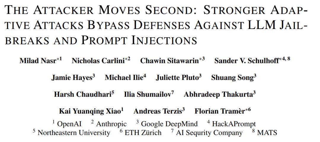 论文标题:The Attacker Moves Second: Stronger Adaptive Attacks Bypass Defenses Against Llm Jailbreaks and Prompt Injections