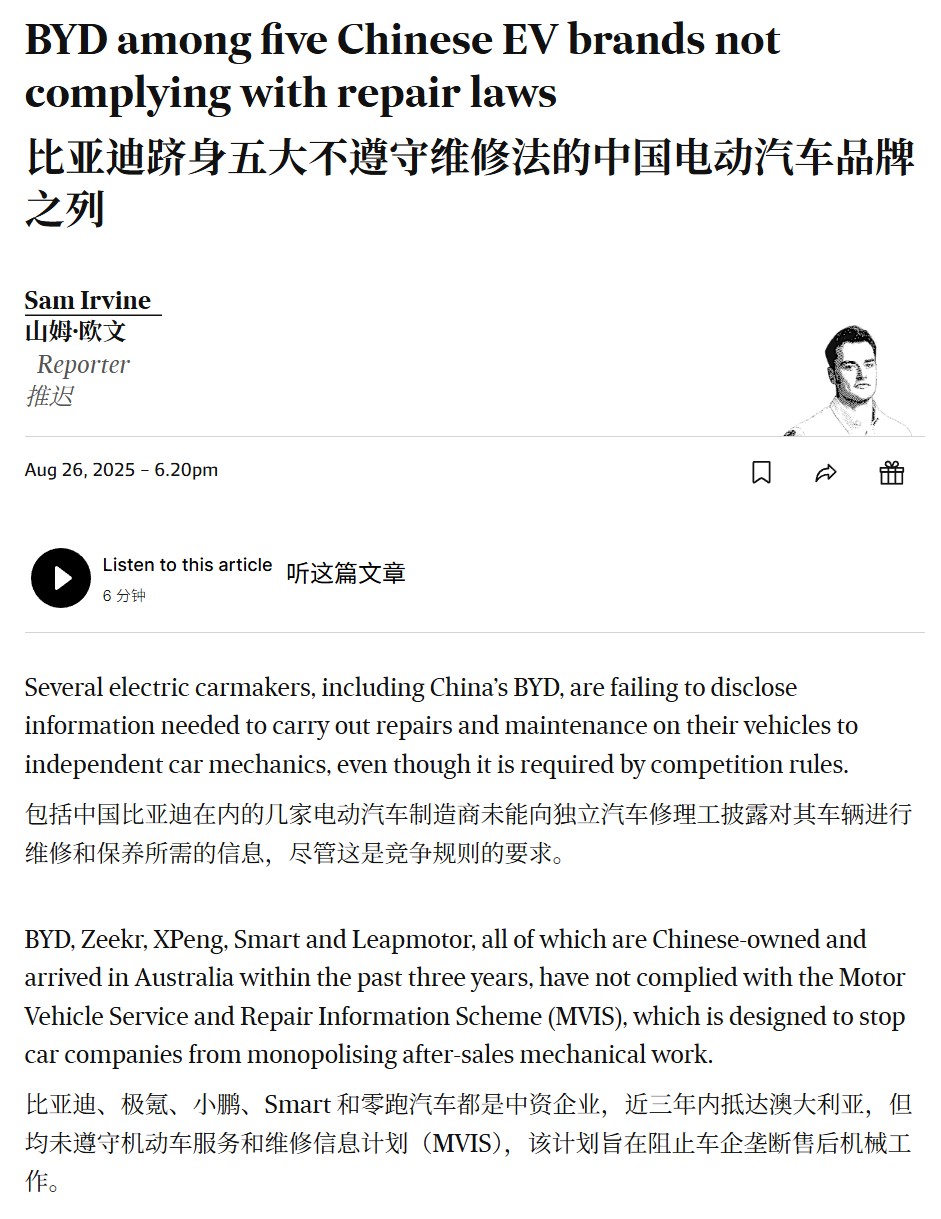 前段时间,澳大利亚媒体就曝出这么个事,说比亚迪、极氪等车企,没有按照当地《机动车服务和维修信息制度》(MVIS)的规定,公开诊断软件、维修参数等信息,搞得外面修理厂没法修这些车。
