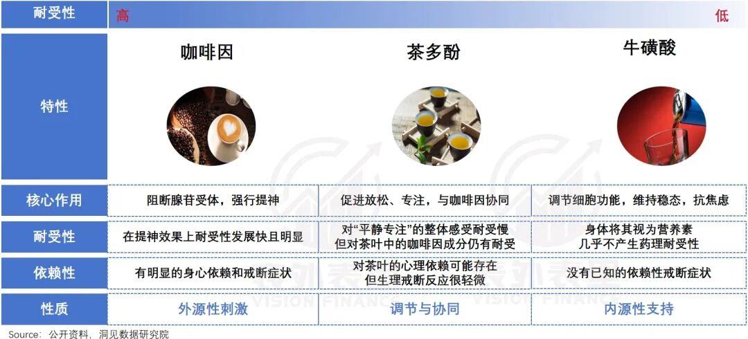 毕竟能量饮料配方主打“牛磺酸+咖啡因”,其中牛磺酸是天然存在于人体内的氨基酸,摄入后更不容易产生耐受性。且目前能量饮料远不如茶咖流行,对大多数人来说,提神效果依旧“立竿见影”。