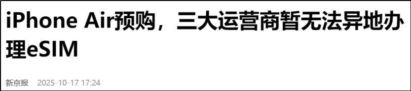 10月17日,“史上最薄iPhone”iPhone Air开启预购,官网五分钟售罄,多个线下店也均显示“无货”。之所以疯抢,有个重要原因是:它是国内首款支持eSIM的智能手机。